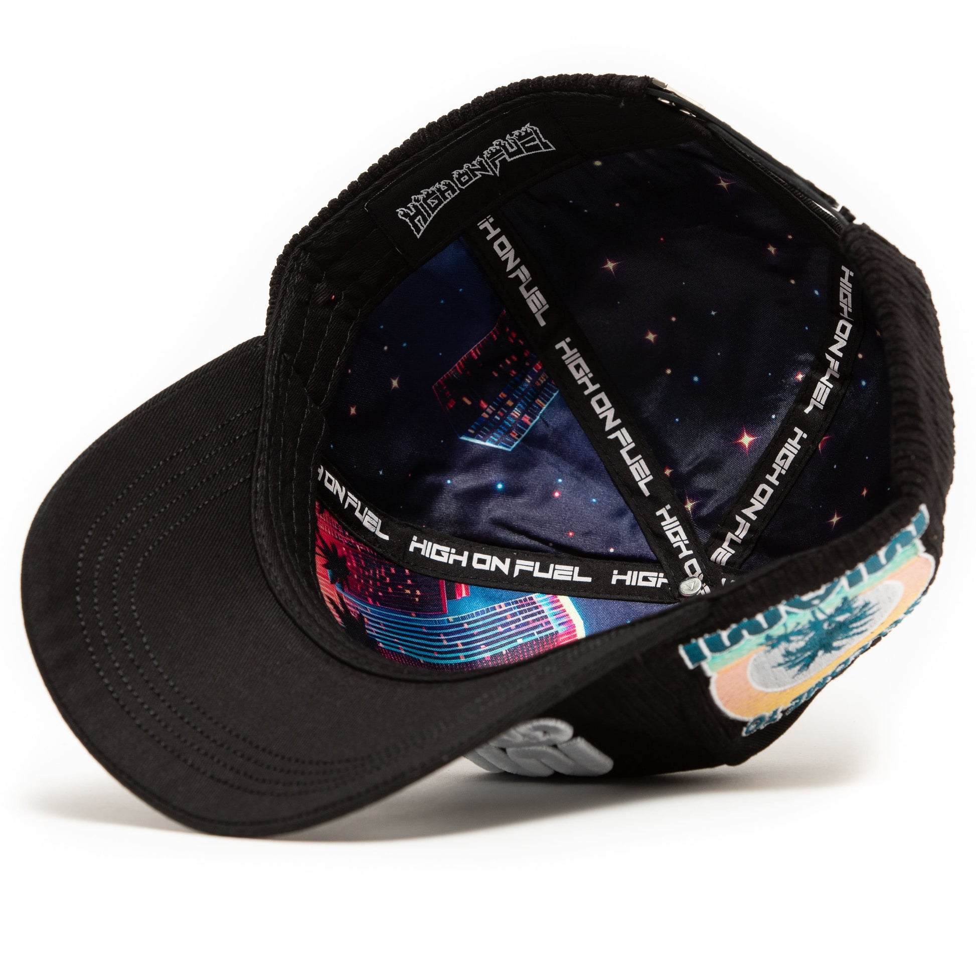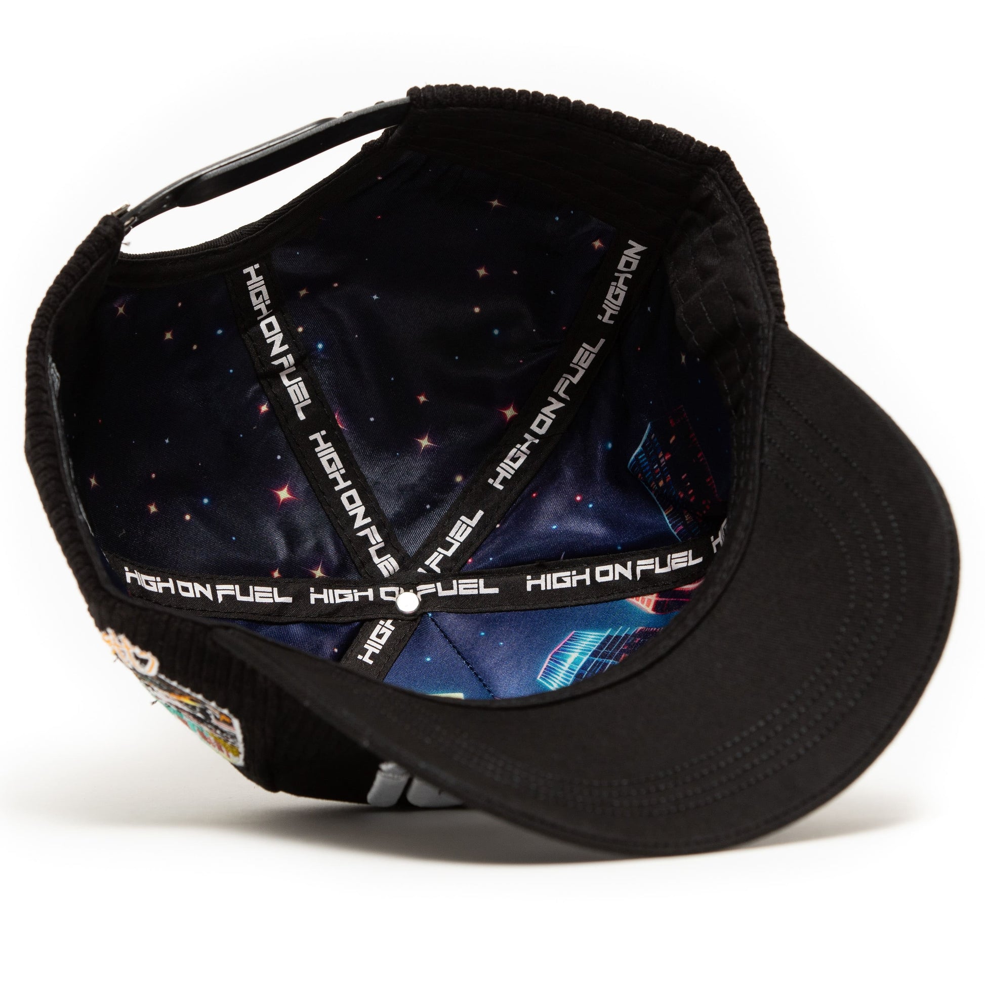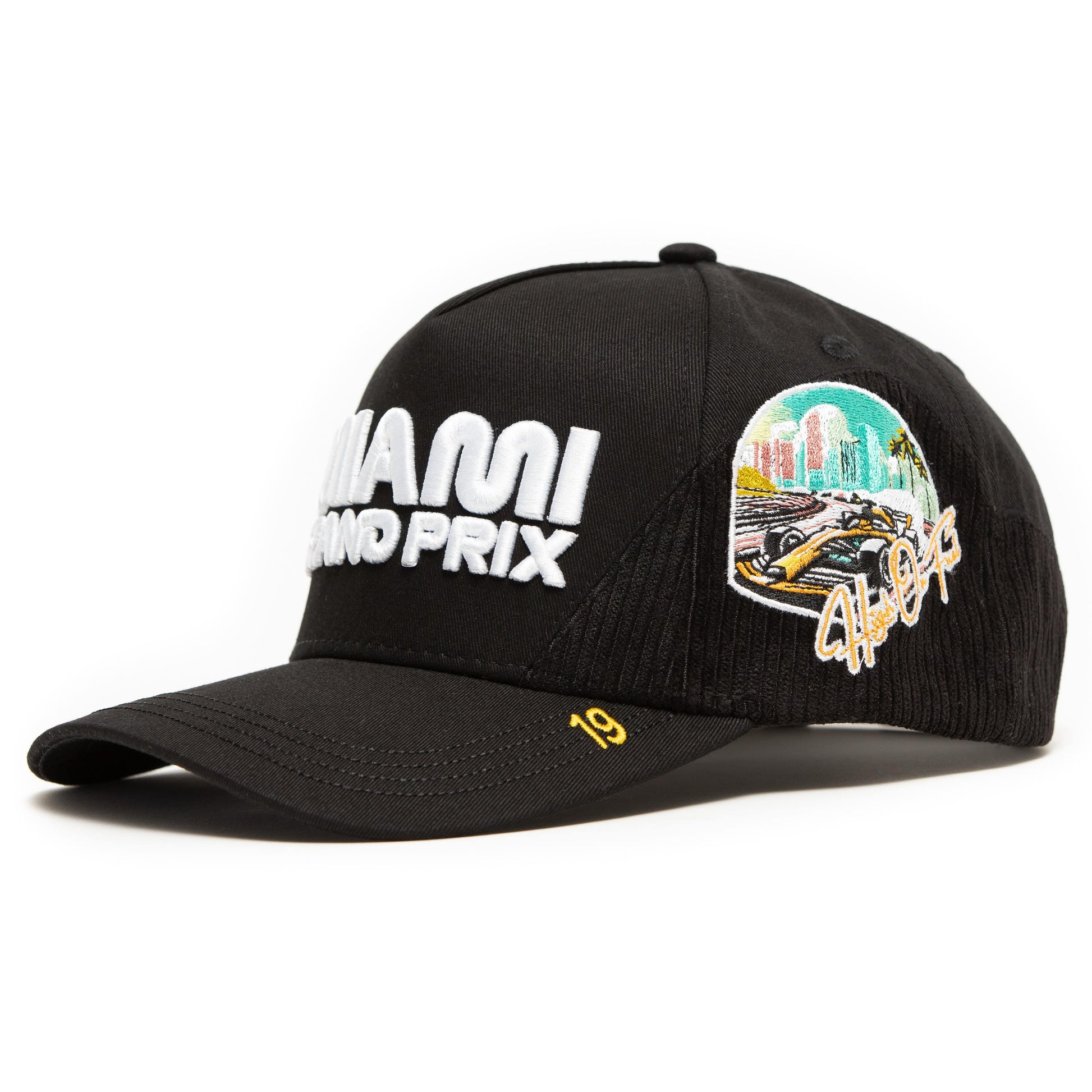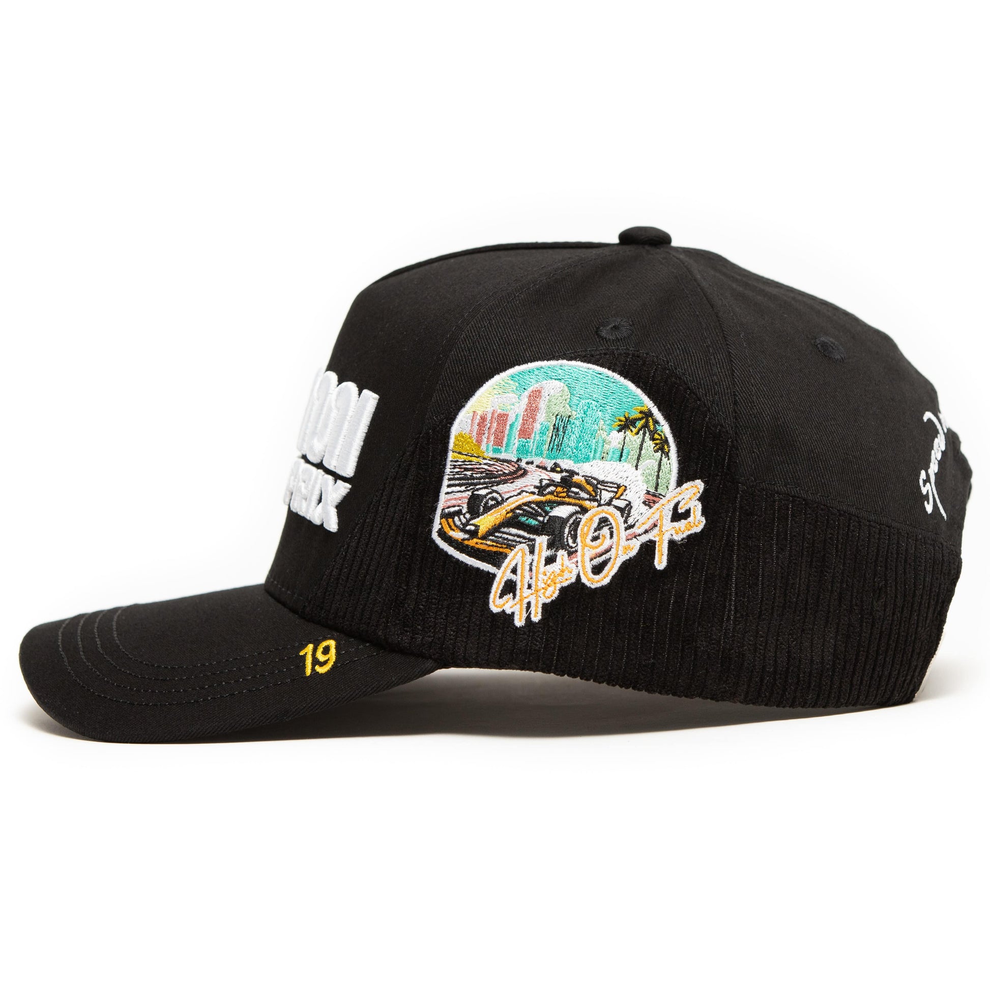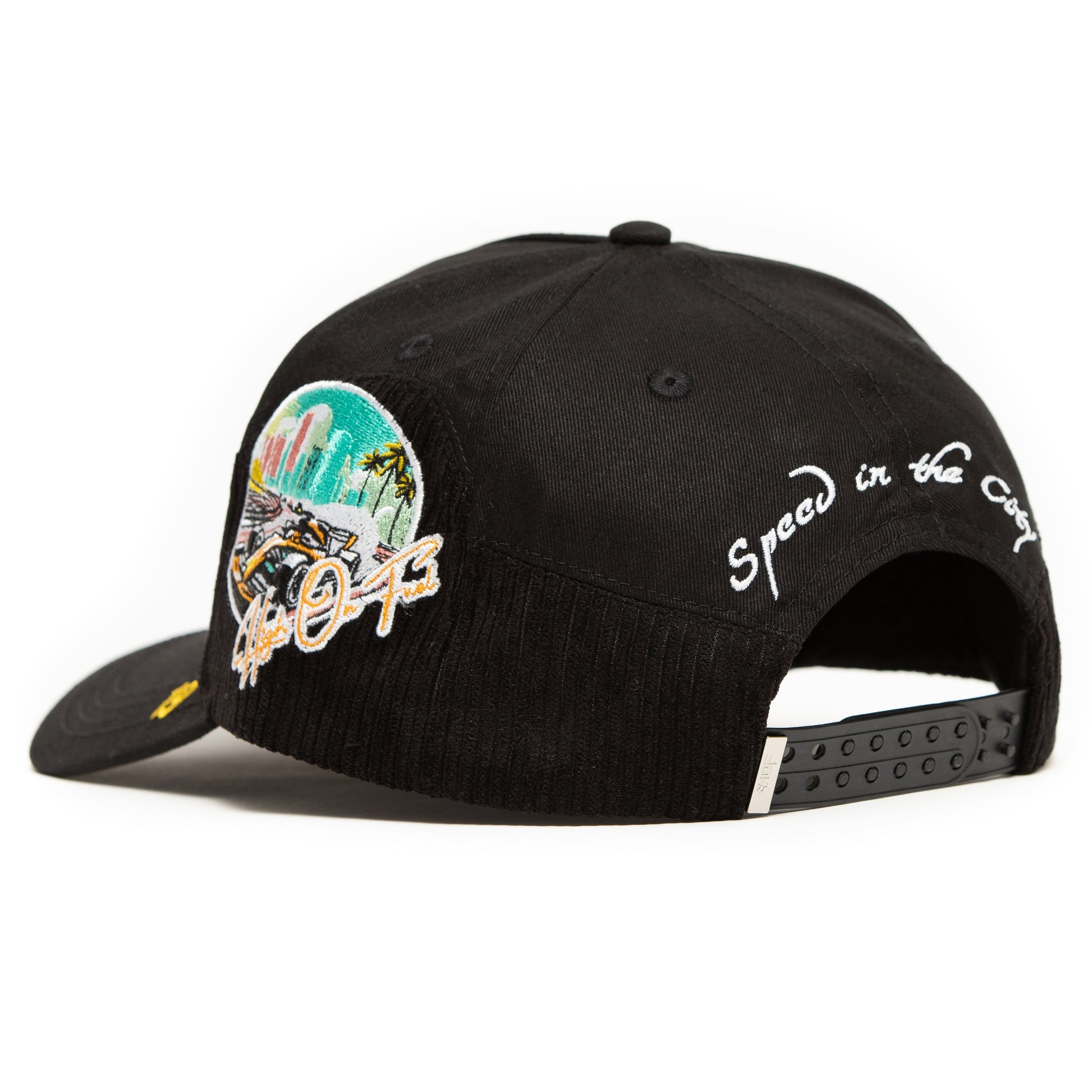 Snapback: One size fits most Shell & Brim: Black corduroy & cotton built for race day Interior: Silk lining for comfort Embroidery & Hardware: Full-custom HOF™ details